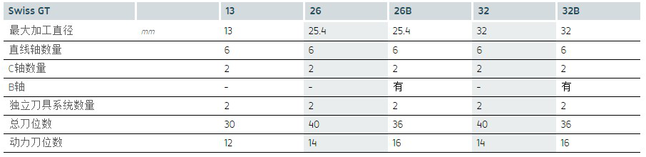 Swiss GT 26 和Swiss GT 32 可安裝高達40把刀具,包括14把動力刀,而Swiss GT 13 可配備多達30把刀具,包含12把動力刀。Y軸大幅提高了背軸加工的能力,無需二次加工即可完成某些復雜工件的生 產(chǎn)。