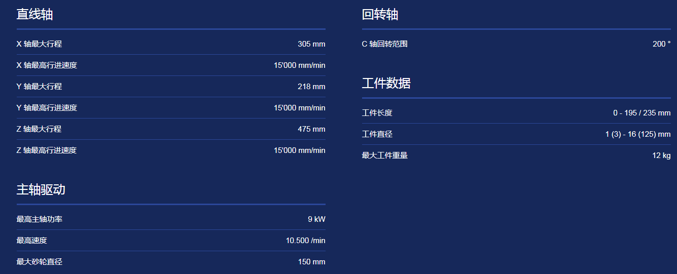適用于生產(chǎn)和重磨直徑范圍從 1 到 125 mm 的旋轉(zhuǎn)對稱刀具??杉庸らL度最大 235 mm、單件重量不超過 12 kg 的刀具。
