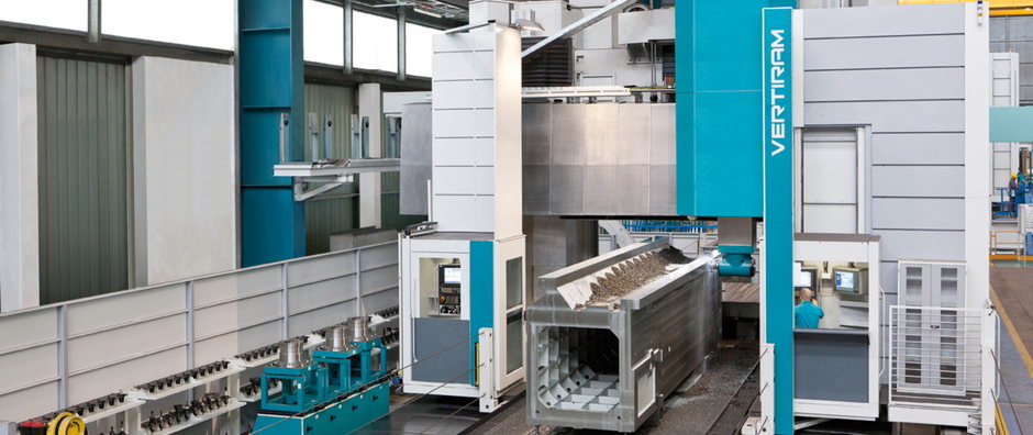●Vertiram加工中心系列由五種基本機(jī)型組成,立柱間距從4600mm到6600mm,主軸端面到工作臺面最大間距從4000mm到5000mm,X軸龍門移動最小行程為6000mm,Z軸滑枕行程為2000mm,W軸橫梁行程從2600mm到3600mm